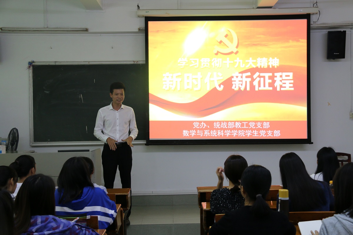 学校党办副主任、统战部副部长兼党支部书记黄文浩作了题为《新时代.新思想.新征程——学习贯彻十九大精神》的专题党课,他重点从“新成就、新使命、新思想、新征程、新经济、新政治、新文化、新社会、新生态、新国防、新统一、新外交、新党建”等十三方面,对党的十九大精神进行了系统解读。勉励学生党员以身作则、身先垂范带头学习,领悟好、贯彻好党的十九大精神,带领广大同学们争做新时代新青年,在学新思想中努力做到有新担当、有新作为、做新奉献。