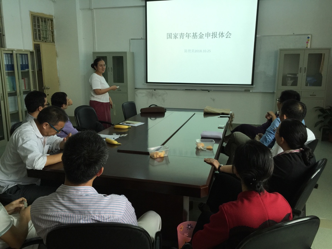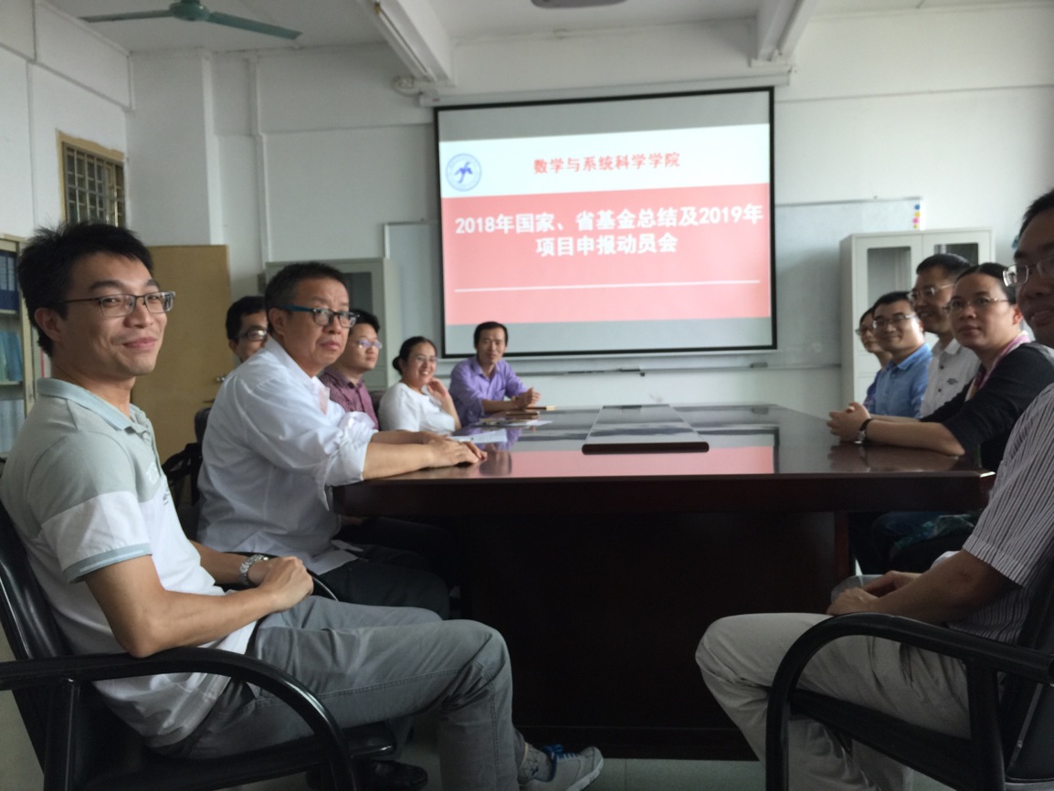 2018年10月25日,太阳成集团tyc122cc入口在一教1211举行2018年国家、省级基金总结会和2019年项目申报动员会。会议首先对2018年数科院各类科研项目进行总结;其次2018年获国家自然科学基金资助的陈志景博士、陈艳美博士、尹宗斌博士,分别做了精彩报告、分享获资助的成功经验、注意事项、展示申报书等;最后会议分析了2019年数科院申报项目的重点及对各类项目申报进行了动员。