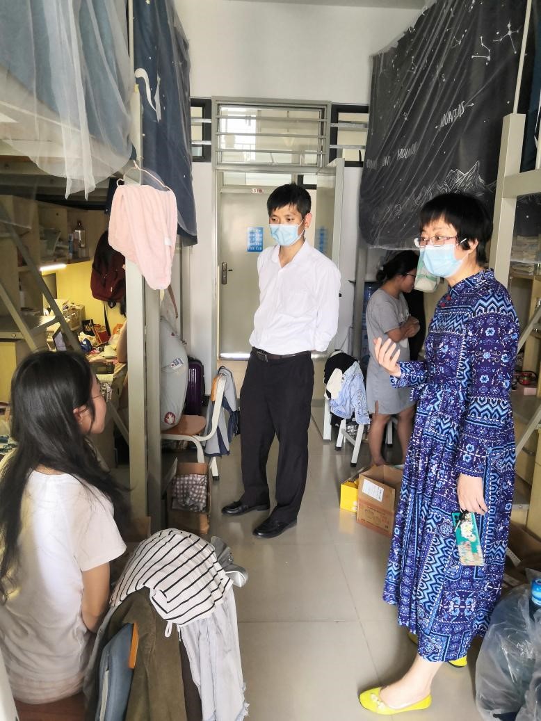 根据广州疫情防控工作的要求,保障师生身体健康和生命安全,白云校区本周开始线上教学。今天是线上教学开始的第一天,为深入了解学生疫情防控下的学习、生活情况,4月11日下午,学院白雪飞书记、梁海华院长、许国良副书记走访了在白云校区的研究生宿舍和19级部分本科生宿舍。