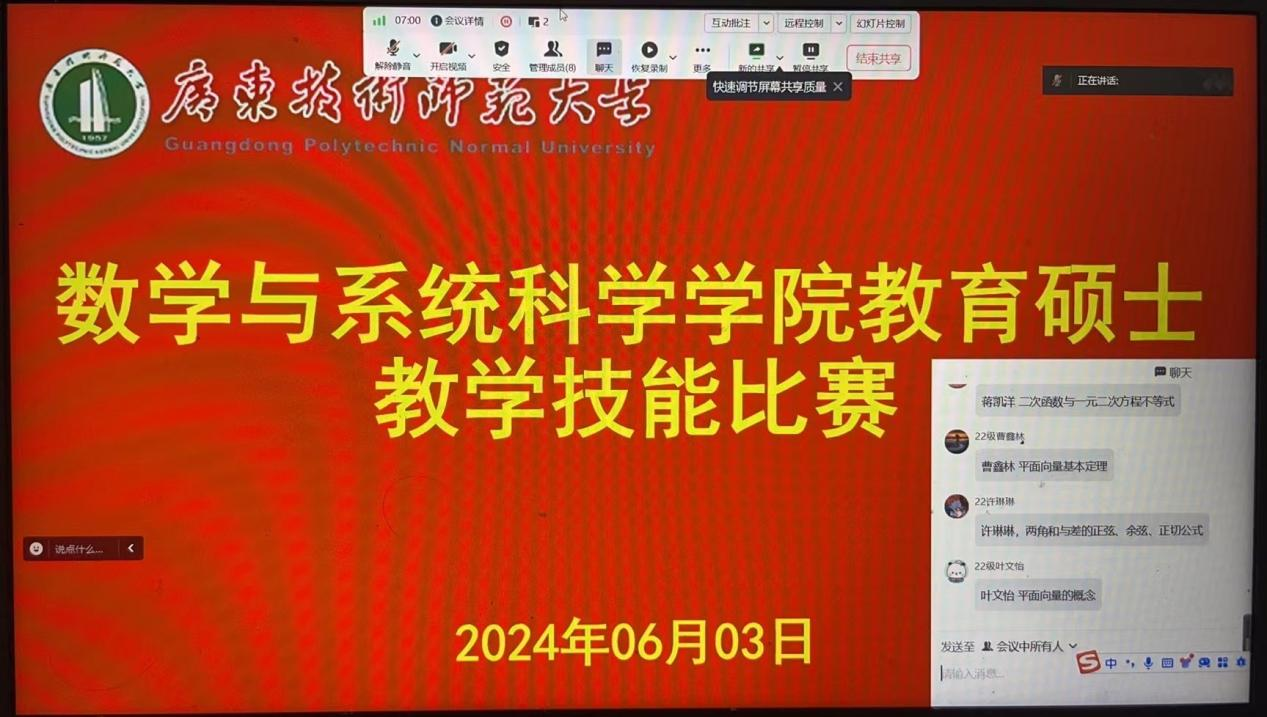 为进一步提高我院硕士研究生的教学能力和综合素养,提升教学竞赛水平,根据《关于举办2024年全国“田家炳杯”全日制教育硕士专业学位研究生学科教学(数学)专业教学技能大赛暨培养研讨会的通知》和《关于举办我校第七届全日制教育硕士教学技能大赛的通知》,我院于6月3日上午通过腾讯会议线上平台举办2022级教育硕士研究生教学技能选拔赛。
