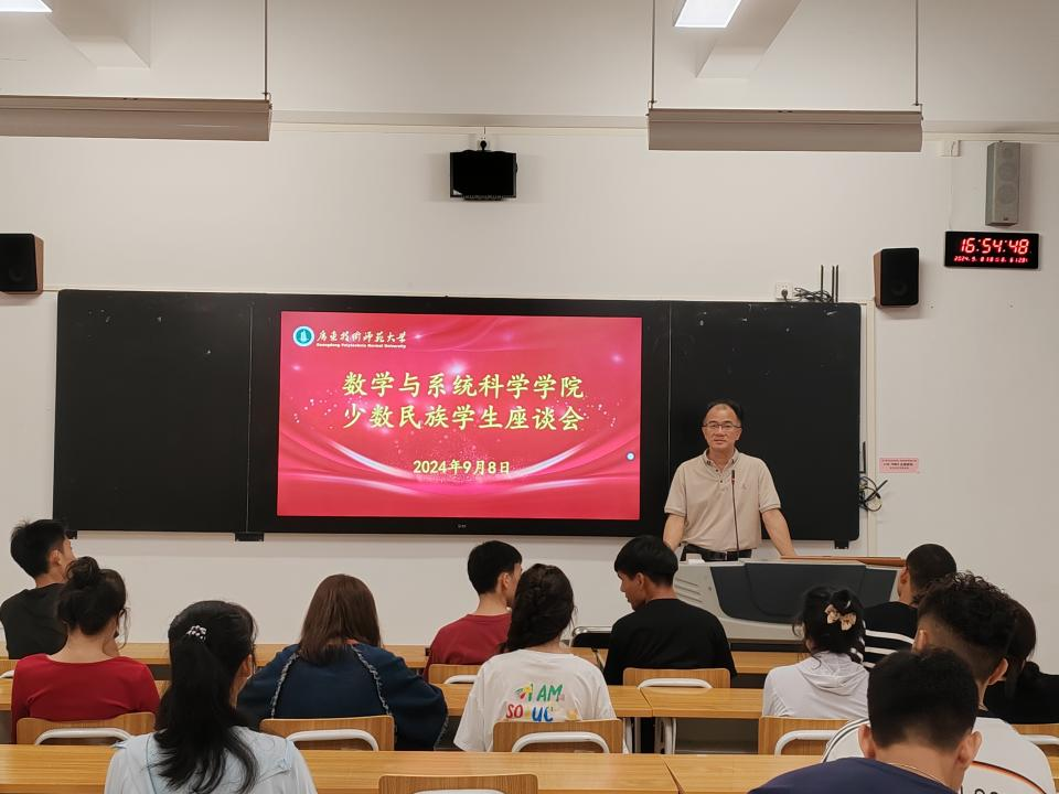 为深入了解2024级少数民族生学习、生活情况,进一步加强新疆籍学生的服务管理工作,2024年98日,数科院在河源校区唯实楼301室召开了新疆籍少数民族学生座谈会。会议由陈齐民老师主持,学院党委副书记许国良出席会议。