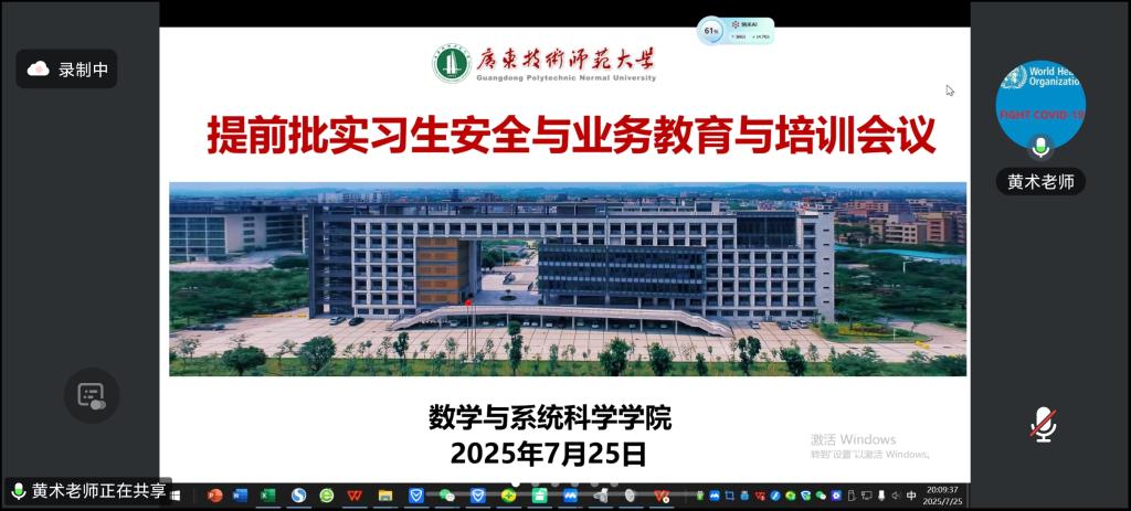 为落实学校实习工作要求,切实保障实习生权益与实习质量,2025年7月25日,我院组织召开提前批实习生安全与业务教育与培训会议,为即将赴阳江、河源等多地开展支教实习的学生做好前置准备。会议由数学系副主任黄术主持开展,我院全体提前批支教实习生参会。