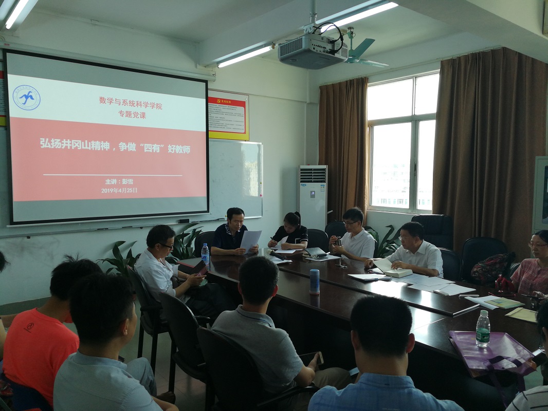 2019年4月25日下午,在校本部一教1211室,太阳成集团tyc122cc入口教工第二党支部召开全体党员会议。会议内容:彭雪书记以《弘扬井冈山精神,争做“四有”好老师》为题,给党员上专题党课。