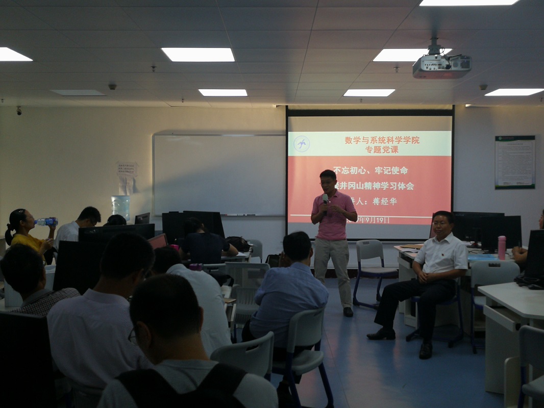 会议有八个内容:一是学院党总支房亚兵书记对“不忘初心、牢记使命”主题教育进行再动员、再部署;二是举行专题党课(题目:不忘初心、牢记使命—-谈井冈山精神学习体会,主讲:教工第二党支部书记蒋经华);三是学习《习近平总书记在“不忘初心、牢记使命”主题教育工作会议上的讲话全文(2019年5月31日)》,领会原著精神实质;四是传达学习《关于进一步加强和规范<中国共产党党员党费证>管理的通知》(广师大党组〔2019〕53号),研究贯彻落实措施;五是传达学习《广东技术师范大学基层党支部组织设置工作指引》(广师大党委〔2019〕91号)精神,研究贯彻落实措施;六是传达学习《广东技术师范大学基层党支部标准化建设工作规范》(广师大党委〔2019〕90号))精神,研究贯彻落实措施;七是讨论数科院教工第二党支部开展“不忘初心、牢记使命”主题教育方案;八是布置“不忘初心、牢记使命”主题教育自学工作。