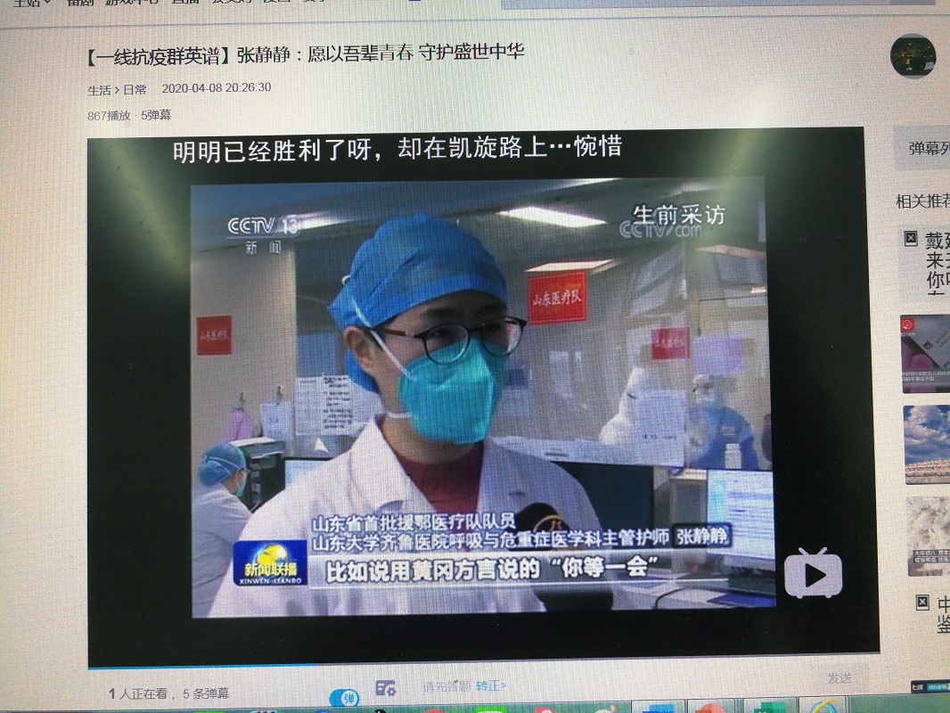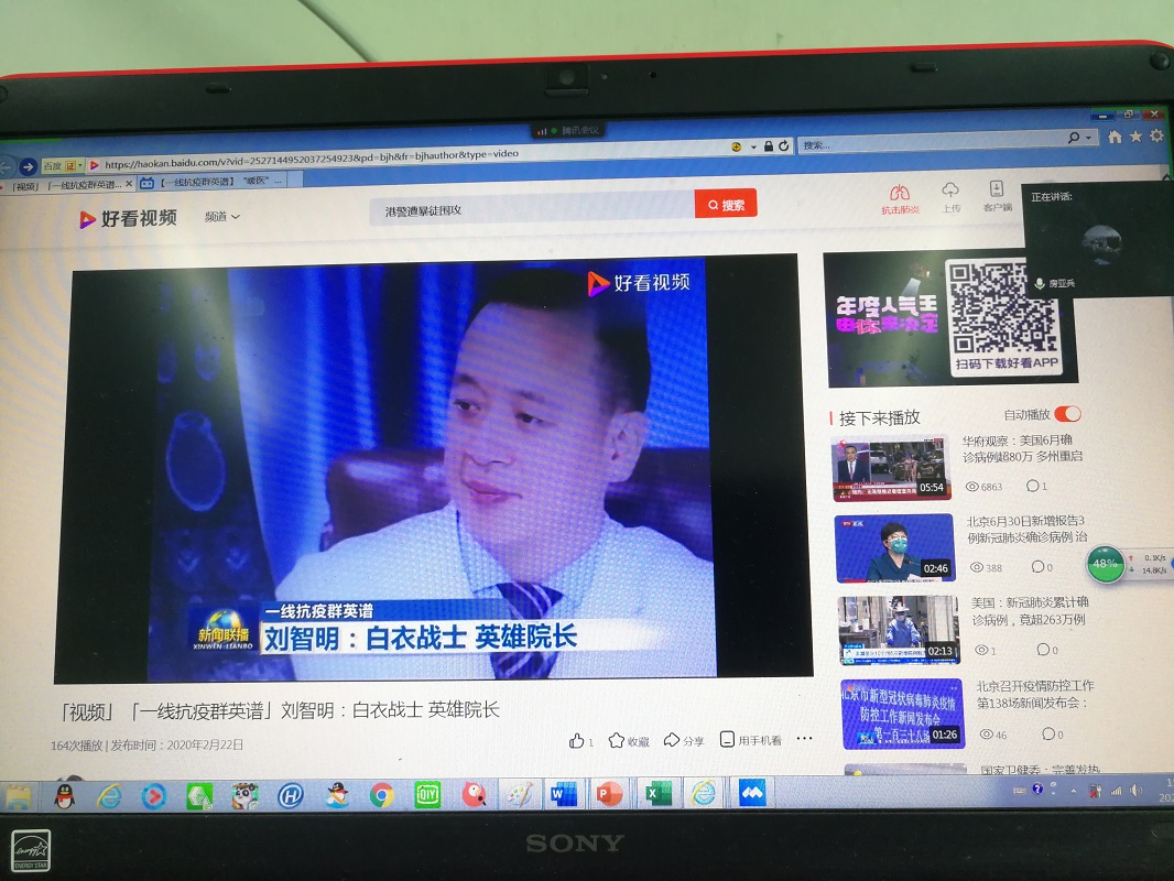 会议首先观看了三位抗疫英雄的先进事迹短片,他们是:武汉市武昌医院院长刘智明;武汉市中心医院甲状腺乳腺科主任江学庆;山东省首批援鄂医疗队队员、山东大学齐鲁医院呼吸与危重症医学科主管护师张静静。