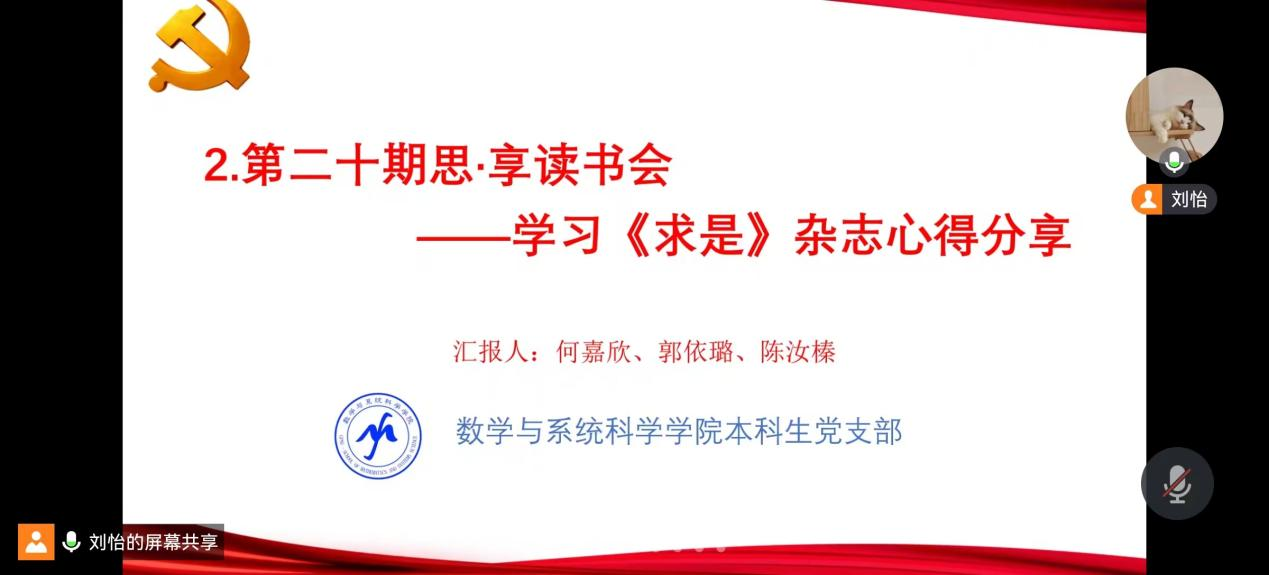 第二十期思·享读书会,全体党员集体学习杂志《求是》,学生党员何嘉欣、郭依璐、陈汝榛作为党员代表作学习心得分享。