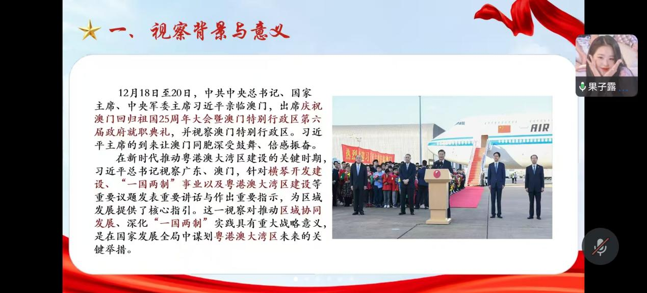 会上,全体党员共同学习习近平总书记视察广东、澳门重要讲话和重要指示精神。学生党员郭依璐作为党员代表分享学习心得。