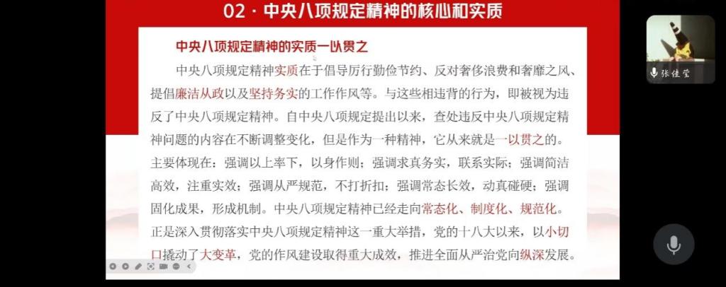 会议集中学习了中央八项规定及其实施细则,深入分析其核心要义和现实意义。学生党员张佳莹作为党员代表分享学习心得。