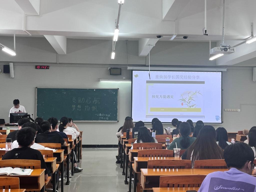 李奕欣同学在学习、竞赛、实践活动中分享自己大学三年的求学历程以及收获到的感悟,并鼓励师弟师妹们积极参加各种竞赛,在学习道路上勇于尝试,敢于试错,不断超越自我。童焕扬同学分享了自己的学习生活和学生干部经历,并鼓励师弟师妹们要夯实自己的专业基础与能力,奋发超越,打造属于自己的精彩大学生活。