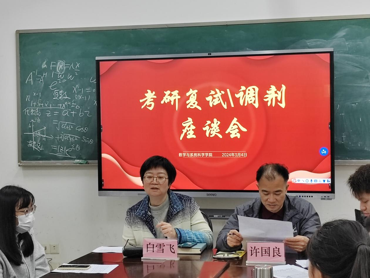 2024年3月4日开展了2024届考研复试/调剂座谈会,党委书记白雪飞、党委副书记许国良、应用统计系专业负责人蒋经华、辅导员曾祥龙出席了本次会议。